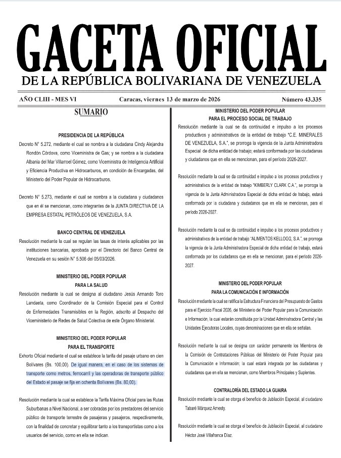 Tras la jornada de paro parcial del pasado lunes 16 de marzo por parte de los transportistas, quienes exigían el ajuste de la tarifa del pasaje urbano, se difundió la Gaceta Oficial número 43.335, en la que el Ministerio de Transporte establece formalmente el monto a 100 bolívares.