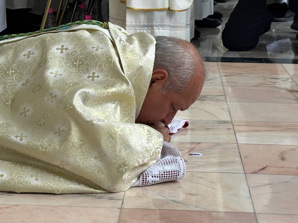 Uno de los momentos más sentidos de la ceremonia ocurrió cuando el nuevo obispo se postró completamente en el suelo, en un antiguo rito de la Iglesia católica que expresa humildad y total entrega al servicio pastoral. El gesto fue recibido con respeto y emoción por los presentes.