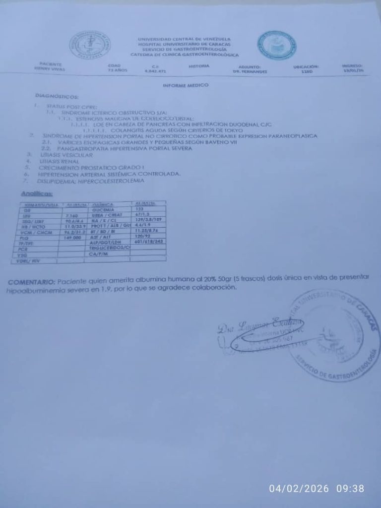 Henry Vivas, de 73 años, requiere con carácter de urgencia cinco frascos de 50gr de albumina humana al 20% para estabilizar sus valores, debido a que desde hace más de 20 días se encuentra recluido en el Hospital Universitario de Caracas, por lo que familiares piden apoyo a quienes puedan colaborar con el medicamento del paciente de cáncer de páncreas.