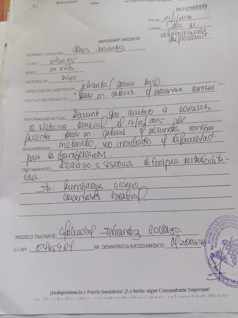 El 21 de enero, Alexis fue llevado a consulta general ante el dolor que presentaba, allí fue diagnosticado con lumbalgia crónica. El tratamiento incluyó cinco sesiones de terapia rehabilitadora.