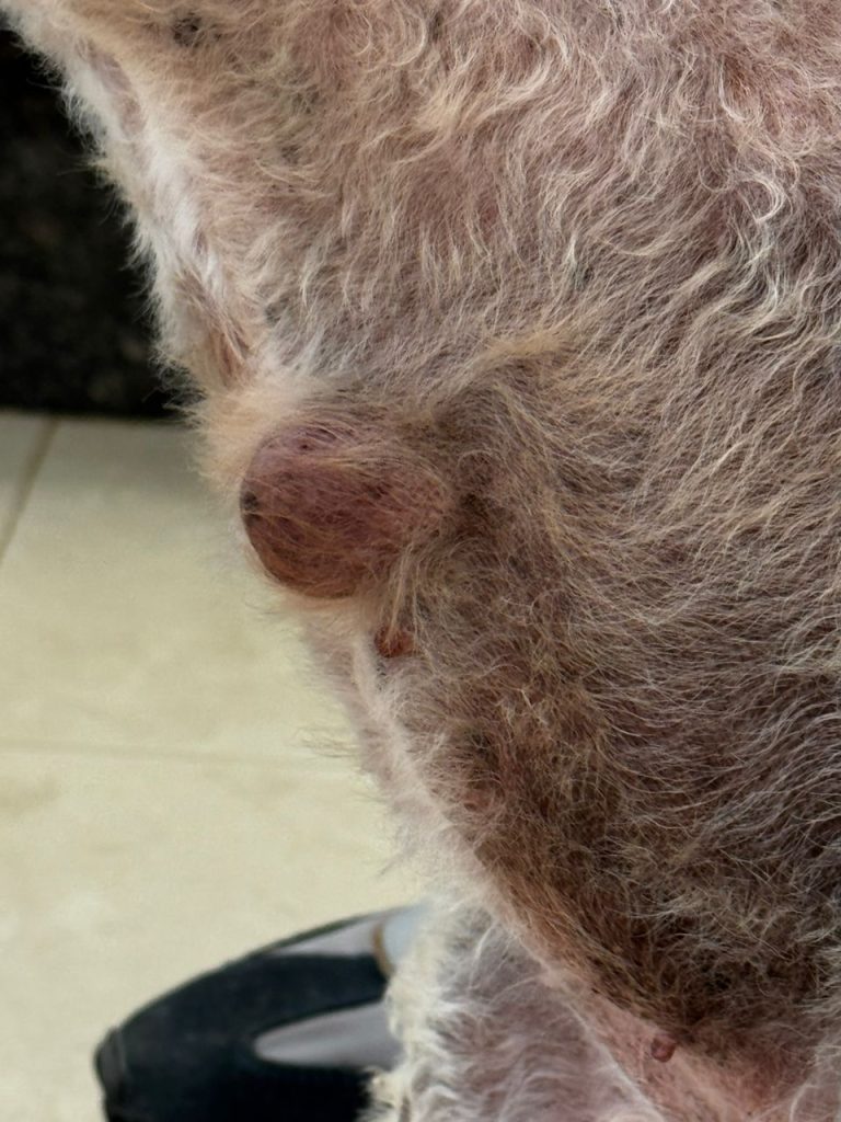 En 2025 lograron retirarle la protuberancia, más no pudieron realizarle la biopsia. Tras la operación todo iba bien con Esmeralda, pero hace unos tres meses comenzó a brotarle un tumor mamario.